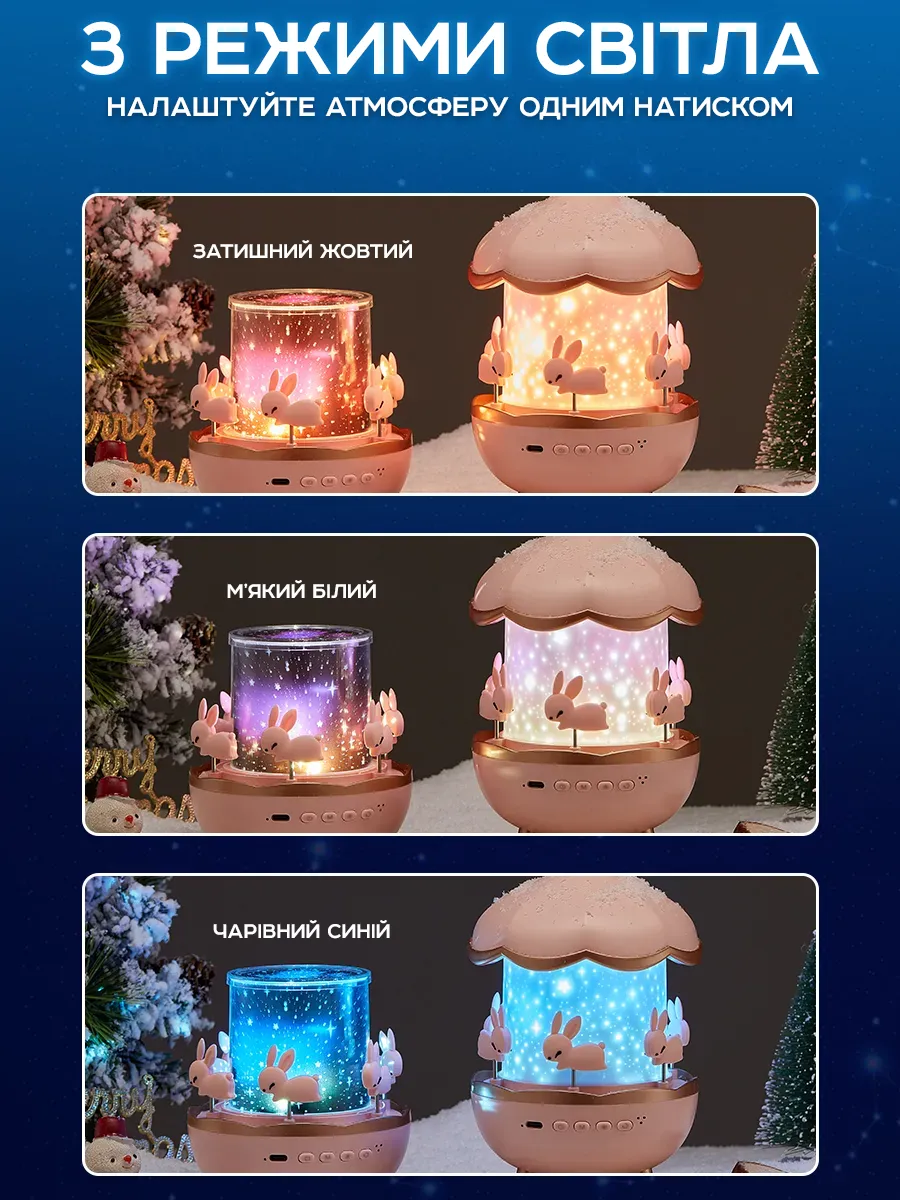 Енергоефективне світло створює м’яке сяйво, що не дратує очі малюка. 3 режими підсвічування білий, жовтий, синій. Проекція бічної картинки - можна зняти кришку каруселі і зробити проекцію верхньої картинки.