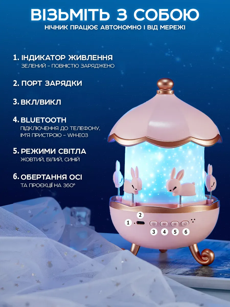 Енергоефективне світло створює м’яке сяйво, що не дратує очі малюка. 3 режими підсвічування білий, жовтий, синій. Проекція бічної картинки - можна зняти кришку каруселі і зробити проекцію верхньої картинки.