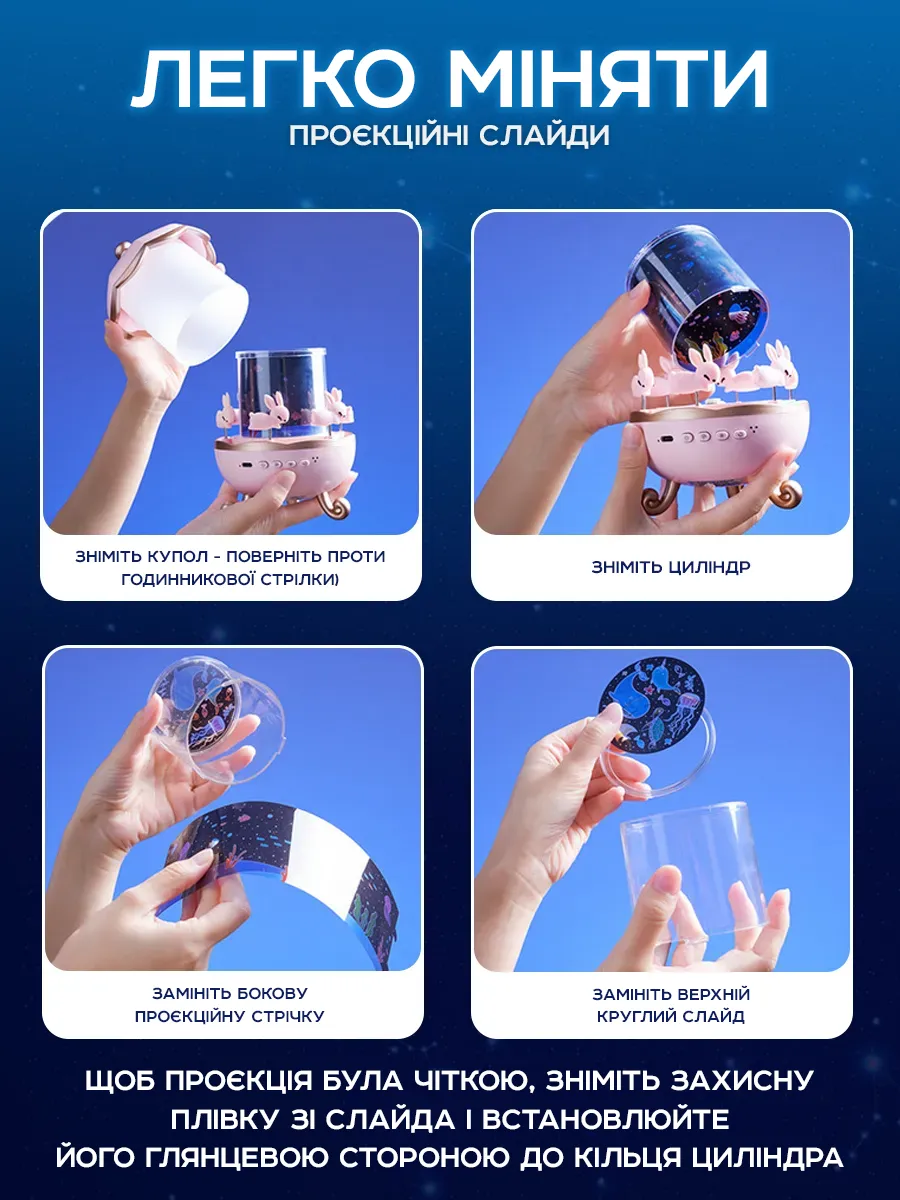 Дитячий нічник-проектор — це чарівний пристрій, що створює неповторну атмосферу в дитячій кімнаті. Він поєднує функції проекційної лампи, музичної скриньки та нічника, ідеально підходячи для створення спокійної та розслаблювальної ситуації перед сном.